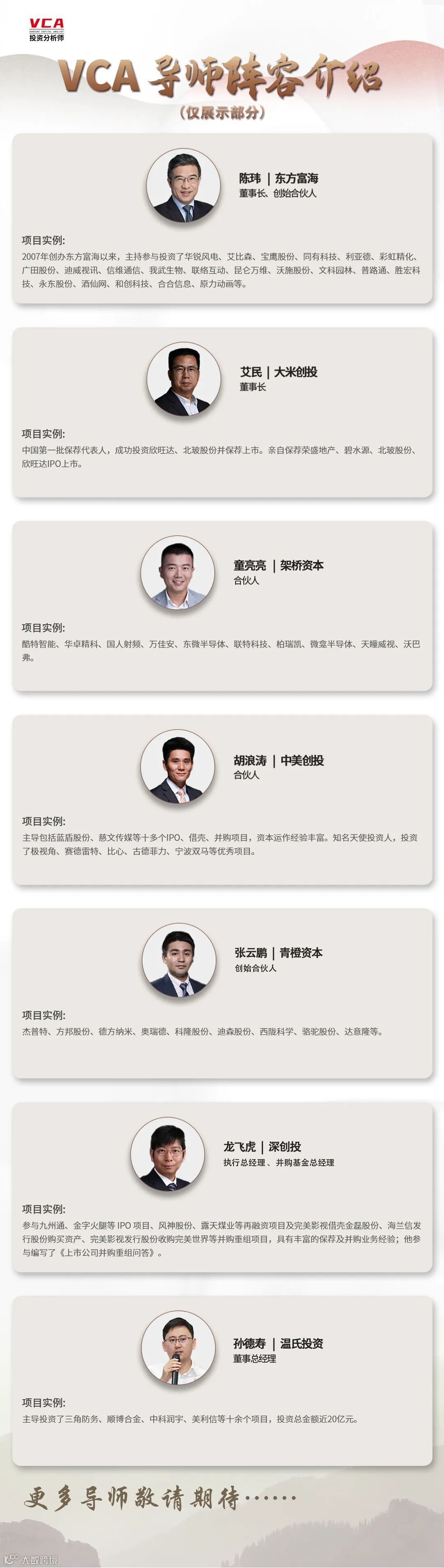 (更多导师名单,请持续关注微信号“投资分析师VCA”)