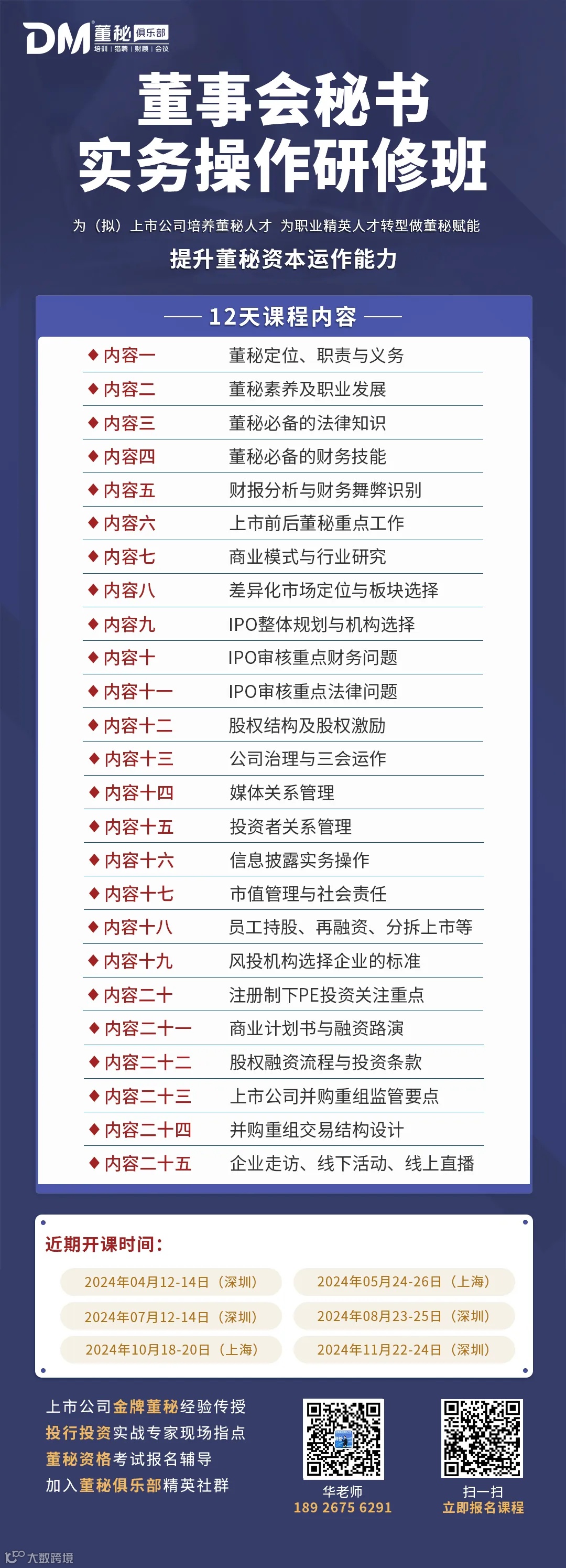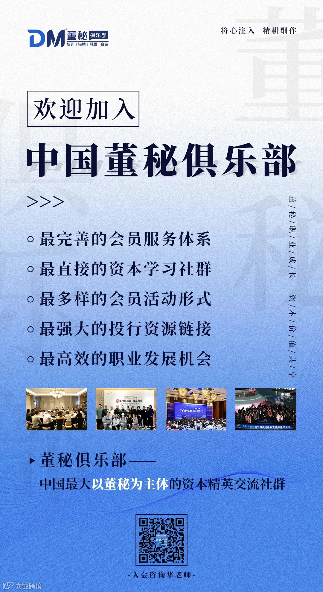 董秘俱乐部紧紧围绕如何推动企业更好的利用资本市场这一核心主题,以互助成长和价值共享为理念,以投行大咖,资深会计师、律师,优秀投资人,上市公司金牌董秘、财务总监、董事长等导师团为依托,通过知识研习、深度访学、讲座交流和资源对接等线上线下形式,助力俱乐部会员快速成长,资源共享,打造中国卓越的资本精英俱乐部。
