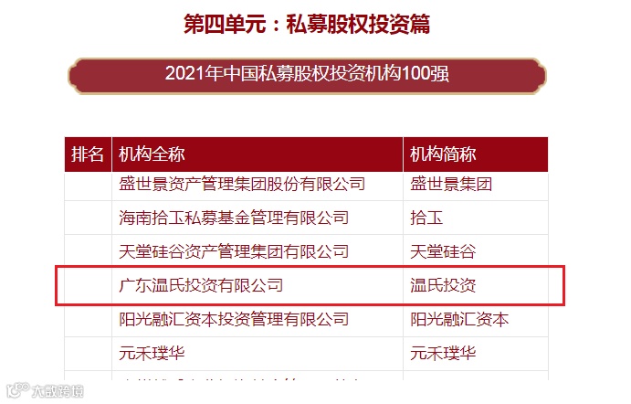 不仅如此,温氏投资还曾于“清科集团2016中国股权投资年度百强榜单”中摘得第29名的名次、获2020年度最佳CVCTOP20、获2021年中国私募股权投资机构100强等投资荣誉,投资实力获得市场高度认可。