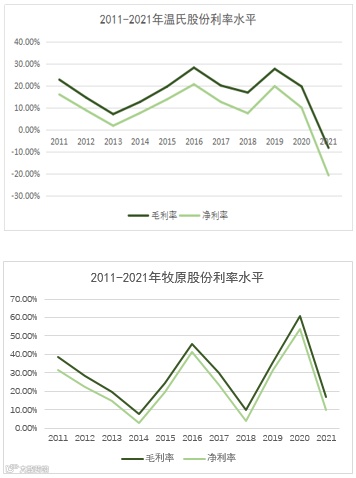 与之相反,牧原股份成立之初规模小,营收与利润只是温氏的零头,2014年上市后发展迅猛,十年间营收规模由11.34亿增长至788.90亿,年复合增长率(CAGR)为52.84%;净利润由3.57亿增长至76.39亿,年复合增长率(CAGR)为35.83%。