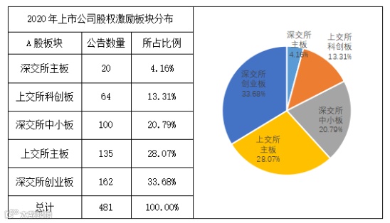 从公告的板块看,创业板公告的股权激励方案数量最多,为162份,占2020年度公告的股权激励方案数量33.68%;其次最多的为主板(上交所主板和深交所主板)合计公告数量为155份,占2020年度公告的股权激励方案数量32.23%;紧随其后的为中小板和科创板,其中科创板公告的股权激励方案数量64份,占2020年度公告的股权激励方案数量13.31%。