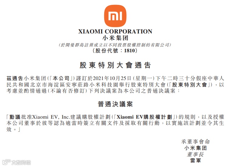 9月30日,港交所公告显示,小米集团将于10月25日举行股东特别大会,以批准采纳Xiaomi EV的股权激励计划,计划授权上限为10亿股,占Xiaomi EV已发行股份总数的10%。