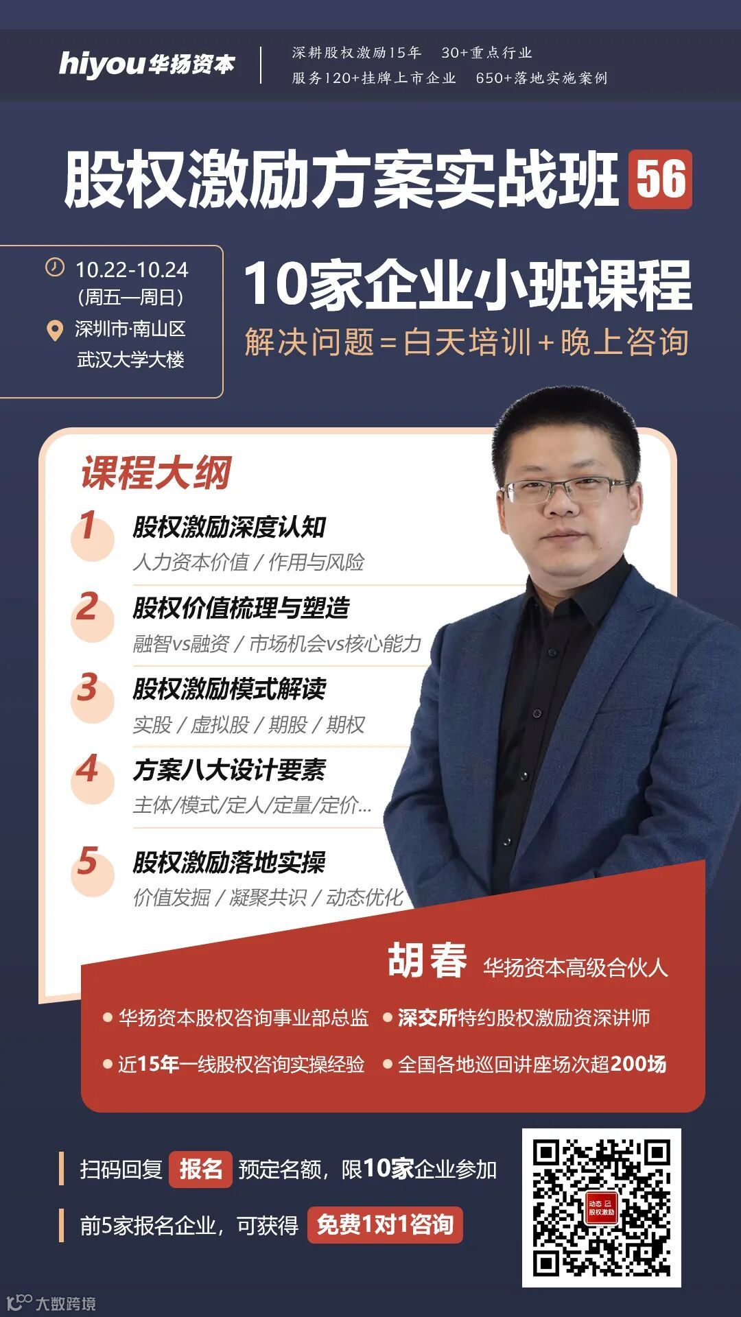 结合15年股权顶层设计、股权激励方案设计的实战经验,华扬开办了《股权激励方案设计实战班》,旨在为广大优秀企业家、高管人才普及科学的股权认知,分享股权激励方案设计的思路与技巧,助力企业资本价值提升!