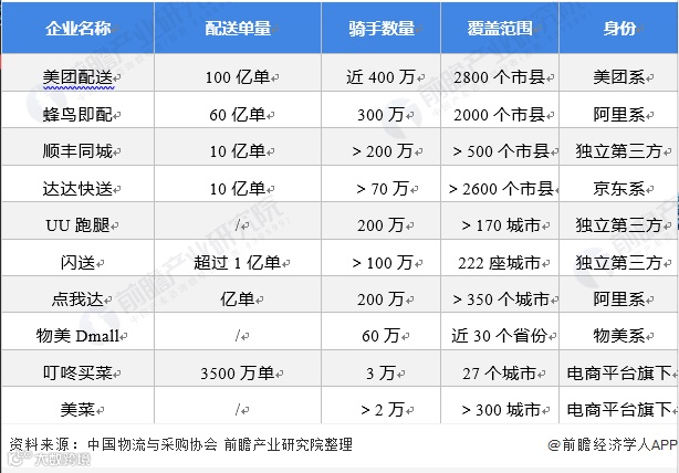 而面对庞大的市场体量,众多企业也纷纷涌入争抢即时配送这块“万亿蛋糕”。按参与者类型来看,目前我国即时配送市场主要参与主体分为三类:外卖平台(以美团外卖、饿了么为首)、即时配送企业(如达达、闪送、UU跑腿等)、快递企业(以顺丰为代表)。