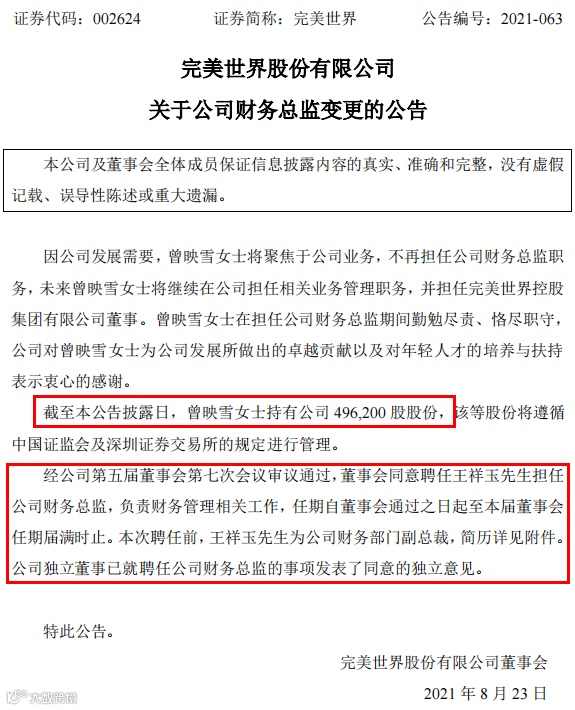 导读:完美世界8月23日发布公告显示,因公司发展需要,原财务总监曾映雪女士将聚焦于公司业务,不再担任公司财务总监职务,董事会同意聘任王祥玉先生担任公司财务总监,负责财务管理相关工作。