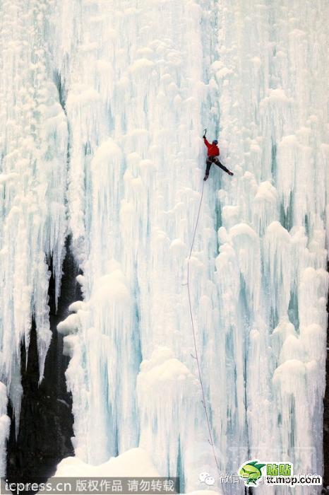 看起来整个银白色的瀑布壮大而美丽,然而极限运动爱好者Will Gadd 和Christian Pondella 联合攀冰,抵达最高点。