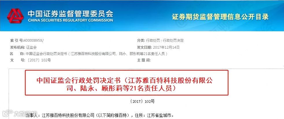 2017年年12月15日,雅百特公告披露,就雅百特以虚构海外工程项目粉饰财务报表的信披违法案件,相关当事人于12月15日收到中国证监会《市场禁入决定书》《行政处罚决定书》。
