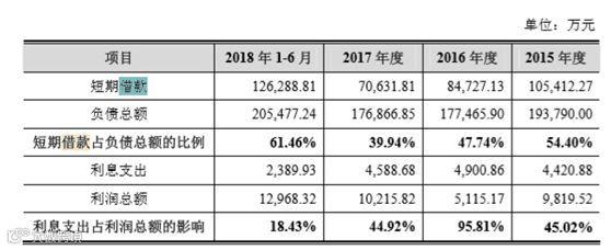 公司2015年末、2016年末、2017年末和2018年6月末,公司短期借款分别为 10.5亿元、8.4亿元、7.6亿元和12.6亿元,占总负债的比 例分别为54.40%、47.74%、39.94%和61.46%。招股书表示,公司短期借款均为向银行借入的款项,供日常资金周转所需。