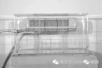 一台空调在模拟密闭环境下连续运转48小时后,所处的玻璃容器壁上已长满霉菌。