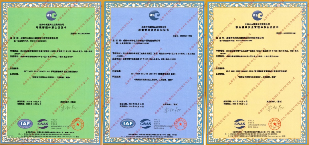 2022年8月,水利部认证机构北京中水源禹认证有限公司对我公司的管理体系进行了认证审核,新实行的环境管理及职业健康安全管理通过初次认证一阶段审核。2022年10月,公司顺利通过环境管理和职业健康安全管理体系第二阶段认证审核。随后,认证机构向我公司正式颁发质量管理体系、环境管理体系、职业健康安全管理体系认证证书。