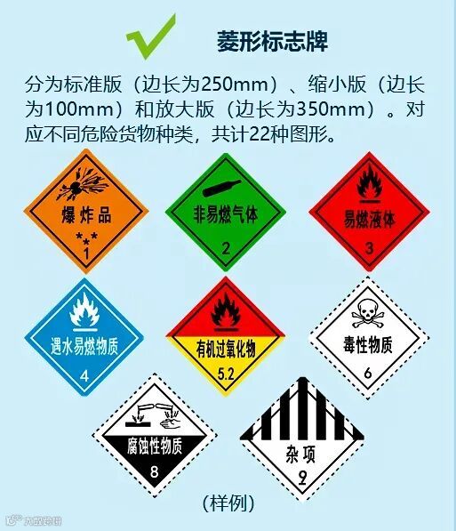 容积不超过3m3的罐体以及内容积小于3m3的集装箱,或从车辆外部无法看清装用在集装箱、罐式集装箱或可移动罐柜的菱形标志牌时,应在车辆两外侧壁和后端装用对应的菱形标志牌。