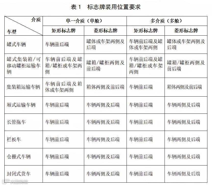 答:本标准附录C规定了标志牌装用的一般要求和三类标志牌的特殊要求,9.2条规定了,“在保障操作安全、不遮挡车辆灯光、号牌等情况下,应在车辆、集装箱、罐式集装箱或可移动罐柜的显著位置装用标志牌,具体的装用位置允许根据实际情况调整”。为便于更好理解标志的装用位置,本标准给出了资料性附录D,作为参考。标志牌具体装用位置要求见表1。