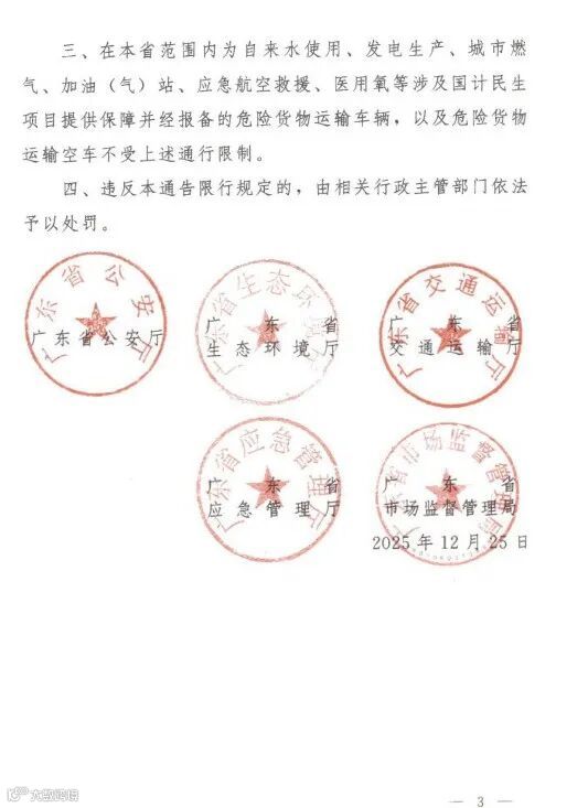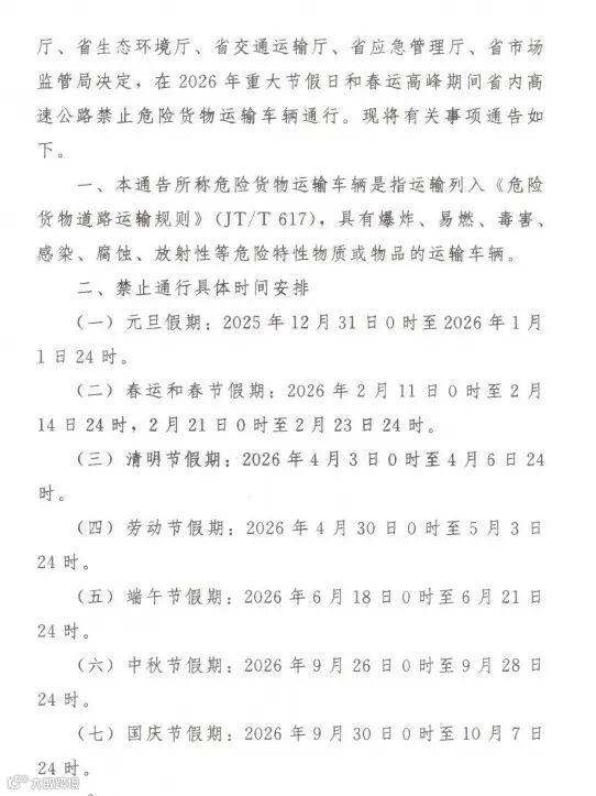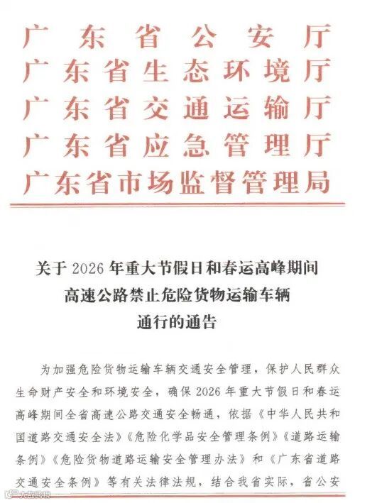 清明节假期:2026年4月3日0时至4月6日24时,广东境内高速公路禁止危险货物运输车辆通行。