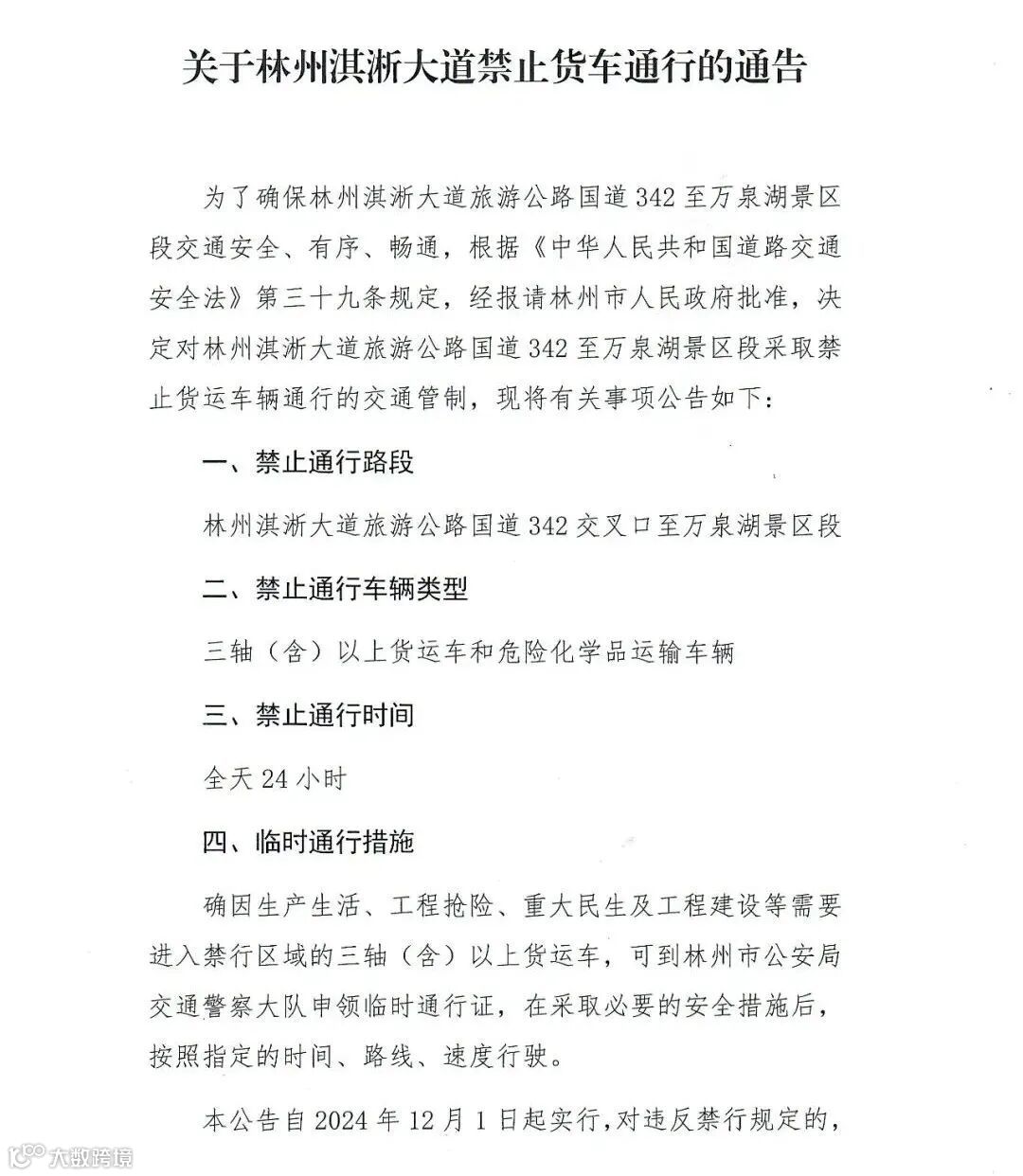 为了确保河南安阳林州淇浙大道旅游公路国道342至万泉湖景区段交通安全、有序、畅通,根据《中华人民共和国道路交通安全法》第三十九条规定,经报请林州市人民政府批准,决定对林州淇浙大道旅游公路国道342至万泉湖景区段采取禁止货运车辆通行的交通管制,现将有关事项公告如下: