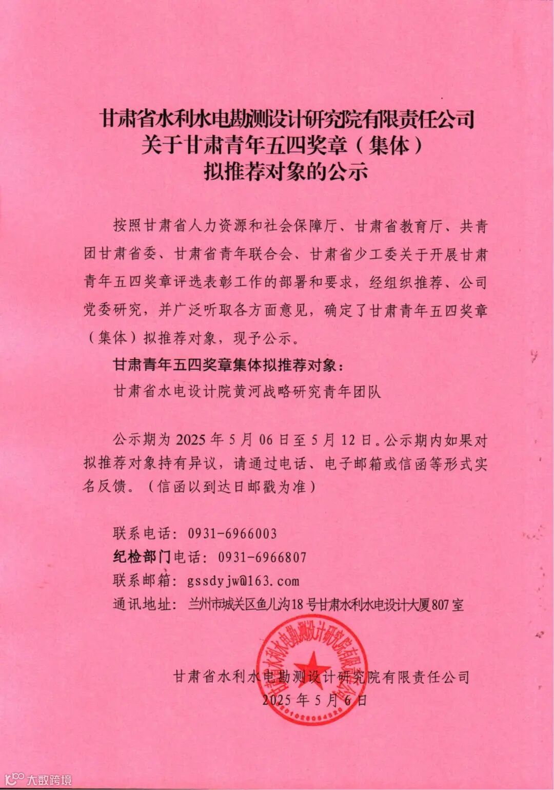 甘肃省水利水电勘测设计研究院有限责任公司关于甘肃青年五四奖章(集体)拟推荐对象的公示