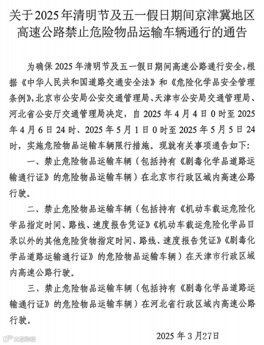 清明假期:为加强危险货物运输道路安全管理,保障我市高速公路通行安全、畅通,根据《重庆市公安局交通管理局关于2025年重大节假日期间对危险货物运输车辆和部分重点货运车辆通行高速公路实施临时交通管制的通告》规定,2025年清明节放假期间,我市高速公路继续实施节假日危险货物运输车辆禁止通行管理措施及部分高速公路对重点货运车辆限制通行管理措施。现将相关信息温馨提示如下: