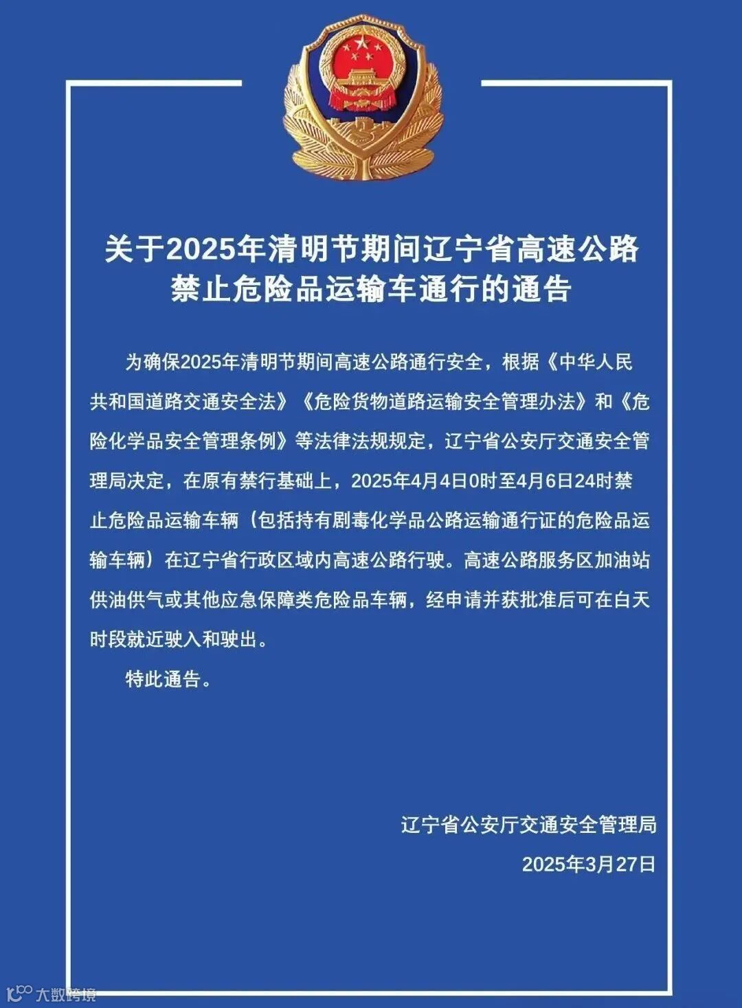 2025年4月4日0时至2025年4月6日24时清明节期间,我市高速公路禁止危险货物运输车辆通行,对确需通行我市高速公路运输的危险货物运输车辆,向上道口属地高速公路支队申请备案通行,经审核通过,按照指定时间、线路、上下道口通行。