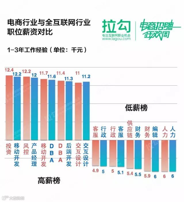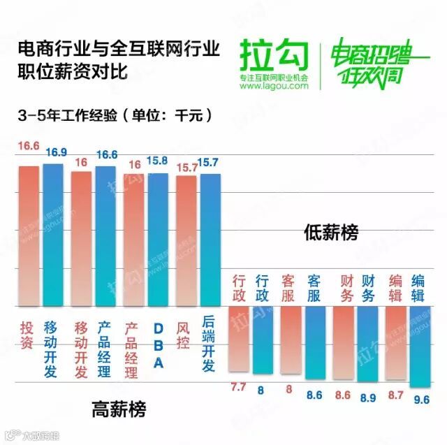 3-5年工作经验中,电商行业中的投资职位薪水高于全互联网行业1k左右。