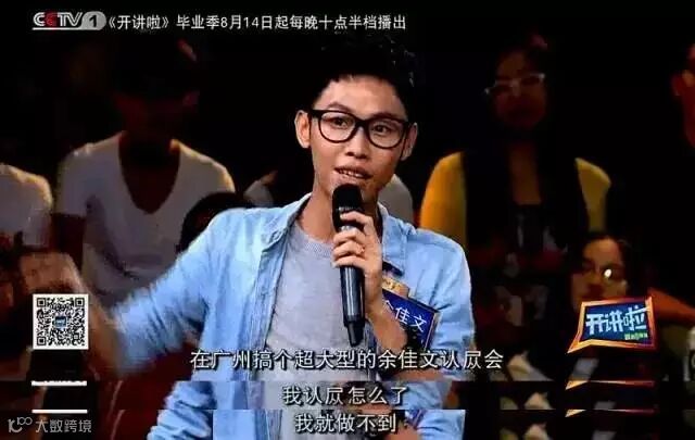 在央视最近一期《开讲啦》节目中,余佳文被撒贝宁提问时,他说:1个亿今年完成了一半但没发,我打算在认怂会承认我做不到,我就算做得到,我也不会去做。我认怂怎么了。言语中还透露着小得意。
