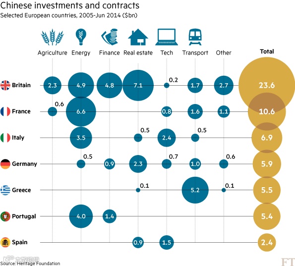 英国金融时报制作的一张图表显示了过去十年间中国在欧洲投资的分布情况(单位:十亿美元):