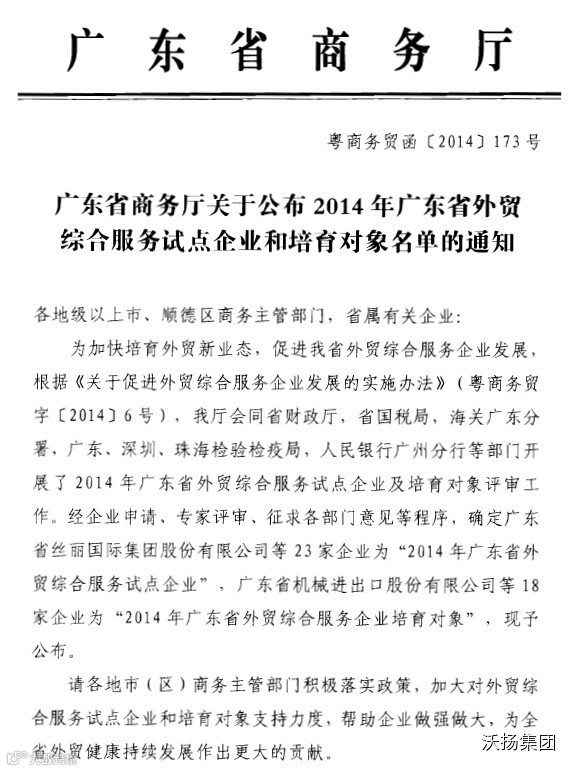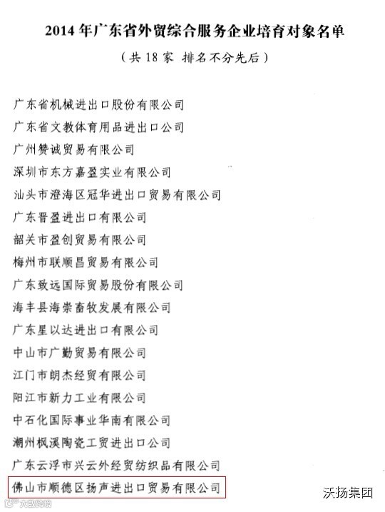 根据广东省商务厅下发的粤商务贸函[2014]173号文件公布内容,本次成为2014年广东省外贸综合服务企业培育对象共18家企业,我司作为顺德区本土企业代表,将继续秉承“诚信为先,客户至上”的经营理念,用心为客户提供专业优质的外贸综合服务,积极响应商务主管部门的外贸支持政策,为全省外贸健康持续发展做出更大的贡献。