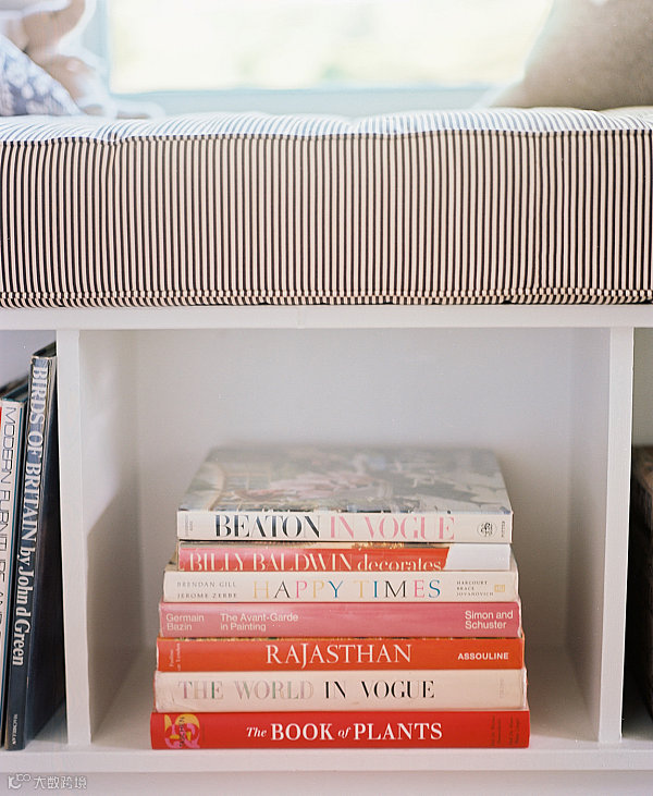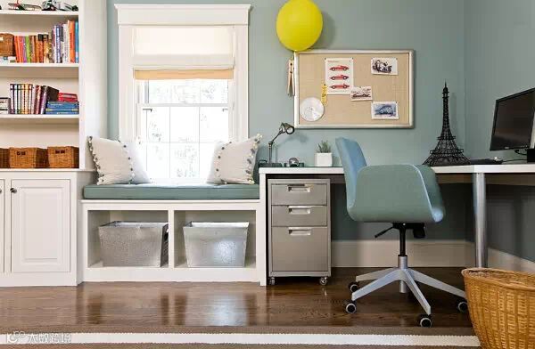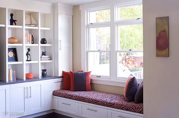 让阿联来谈谈飘窗的收纳,如果联偶在飘窗的还能拥有书架的位置,那么你是幸运的。飘窗的设计可以是开放的,选择一些时尚的收纳箱,就如下图所示!