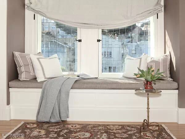 不需要太花俏,飘窗配色应该是自然而融入房间的。下面这个灰色低调的飘窗就很好的融合空间,是那么自然和舒适。
