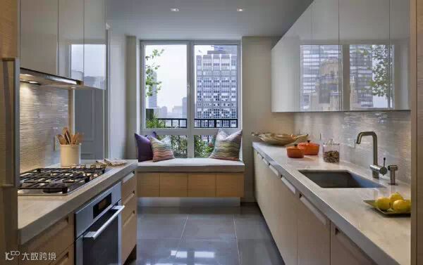 你可能会认为在厨房设有飘窗是一件不理想的事情,但这也是让厨房特别的方式。如果可以把厨房靠窗的位置打扮起来吧,添加一些有图案的枕头,同时还可以将你的厨房引入新的设计理念。