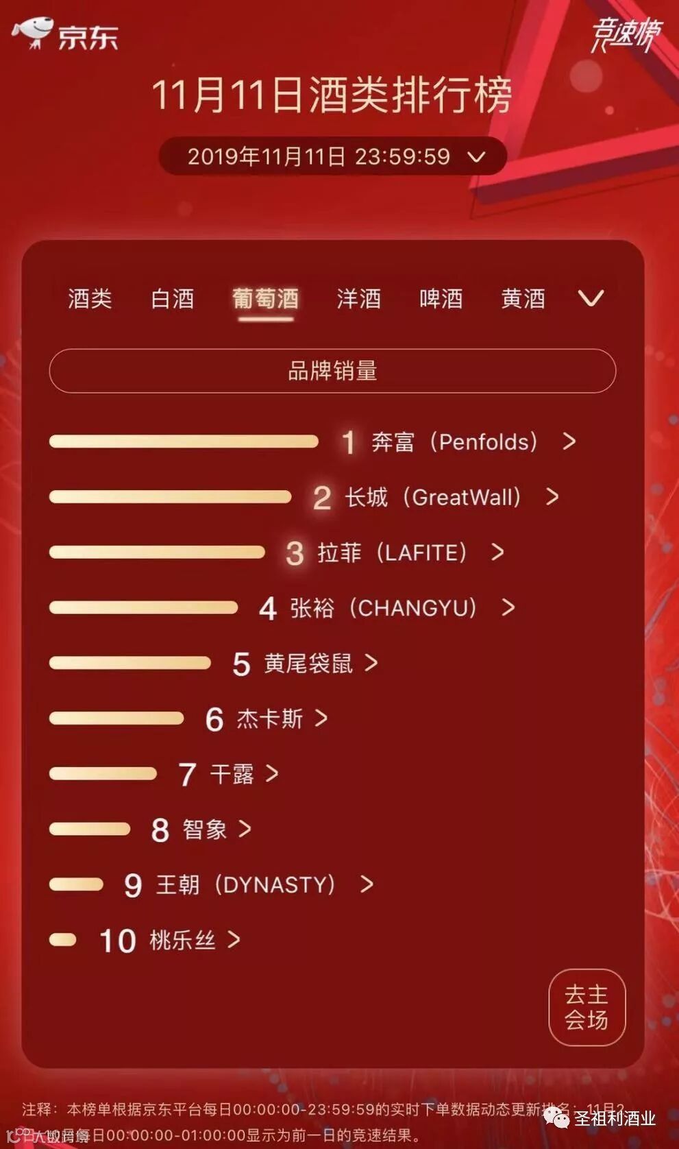 葡萄酒销量TOP10:与2018年相比,奔富(penfolds)排名跃升至首位,智象、桃乐丝进入前十。