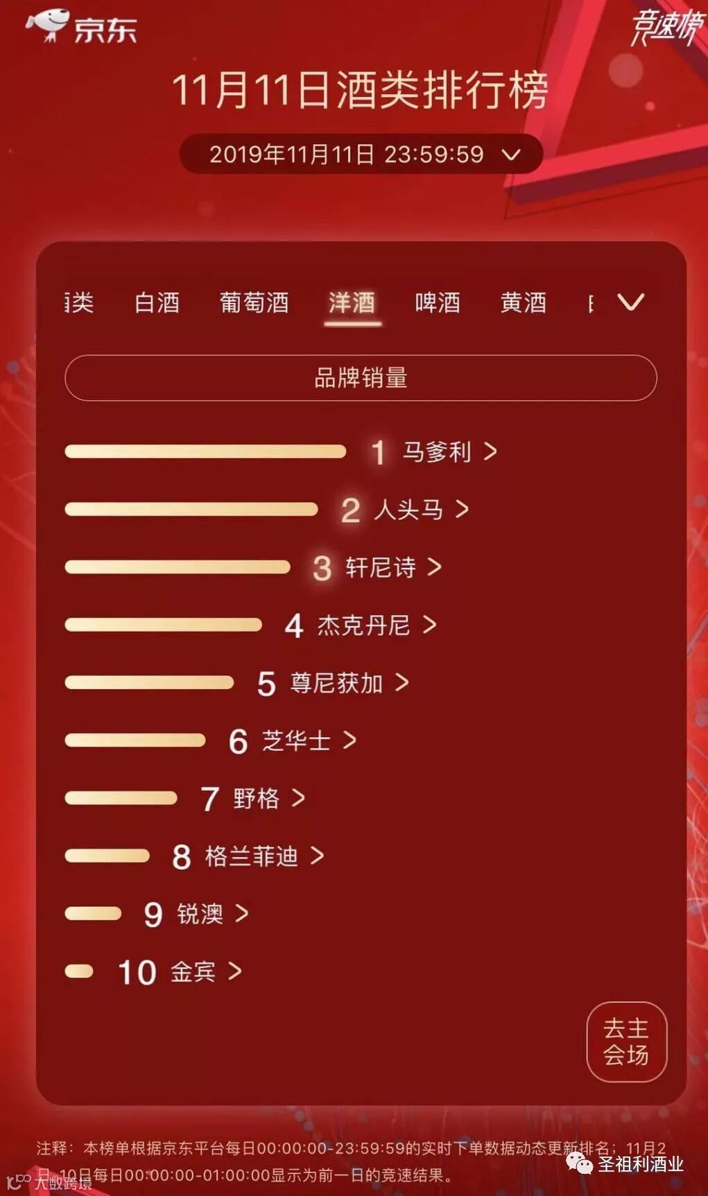 洋酒品牌销量排行榜TOP10:马爹利、人头马、轩尼诗位列前三。