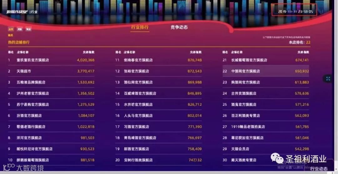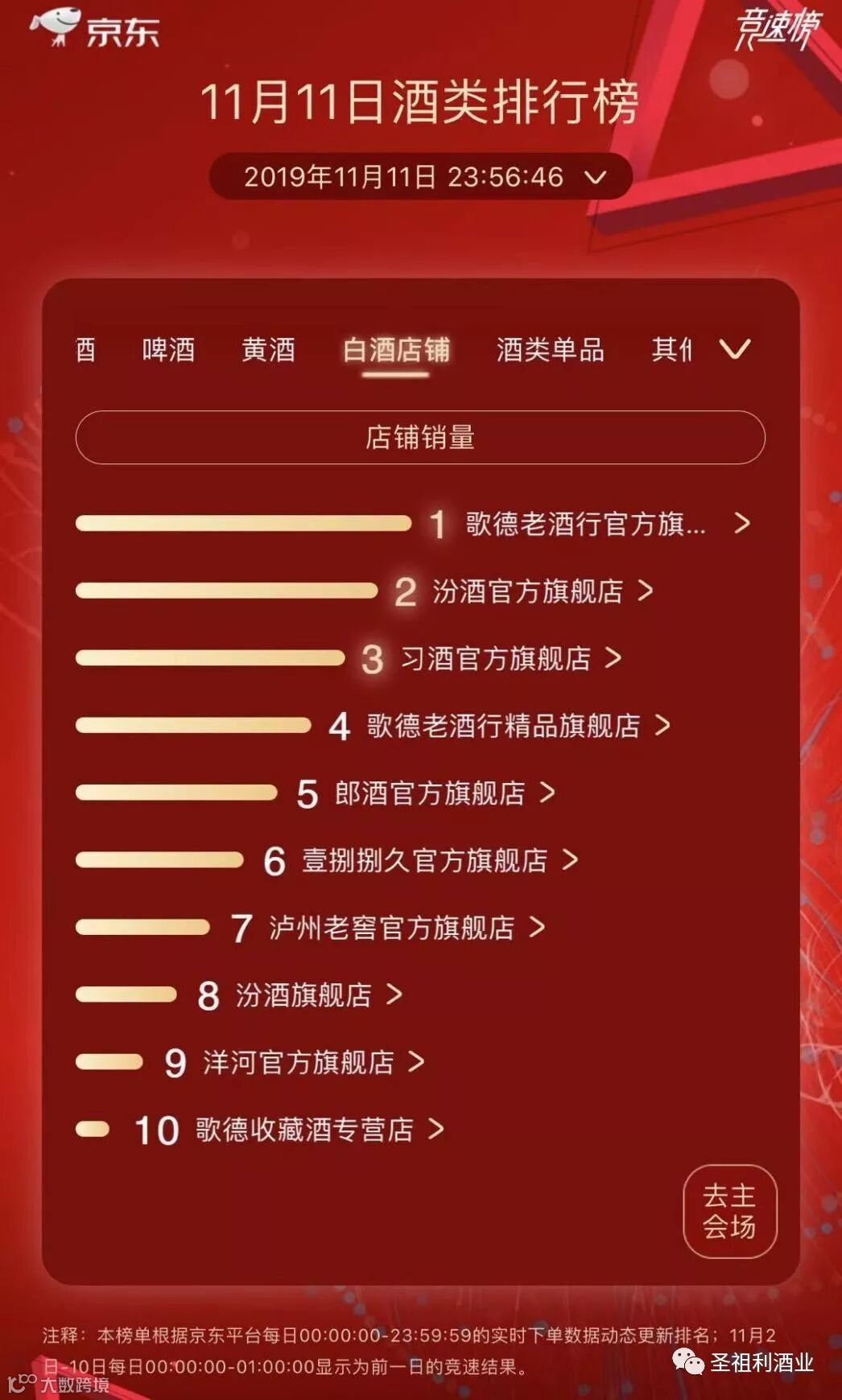 酒类销量店铺排行榜TOP10:歌德老酒行官方旗舰店、汾酒官方旗舰店、习酒官方旗舰店拿下前三名,1919则位居第六。