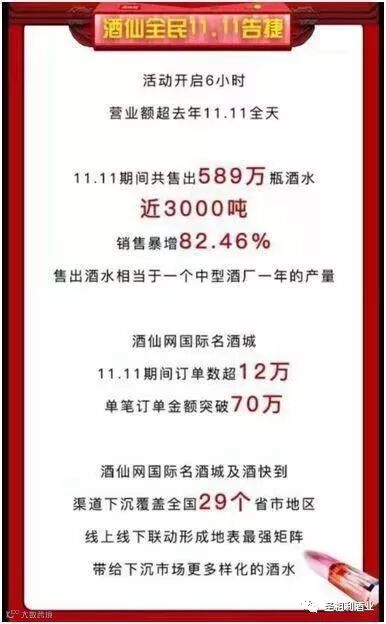 酒水类垂直电商网站酒仙网12日凌晨发布了双十一战报:双十一期间,酒仙网共售出近3000吨约589万瓶酒水,销售同比增长82.46%。