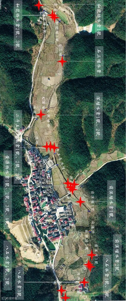 浦江县岩头镇刘笙村,沿着浦阳江支流蜈蚣溪,建有比较密集的溪井,现存有20处溪井,总灌溉面积350亩。其中有一大型溪井——深堰水仓,长15米,宽5米,深0.8米,灌溉面积24亩。