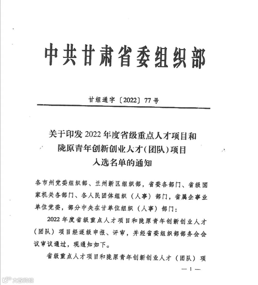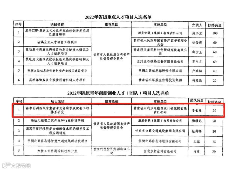 近日,省委组织部印发了《2022年度省级重点人才项目和陇原青年创新创业人才(团队)项目入选名单》,甘肃省水电设计院申报的《南水北调西线甘肃省水资源需求及配套工程体系研究》成功入选“2022年陇原青年创新创业人才(团队)项目”,是集团公司唯一一个入选项目。