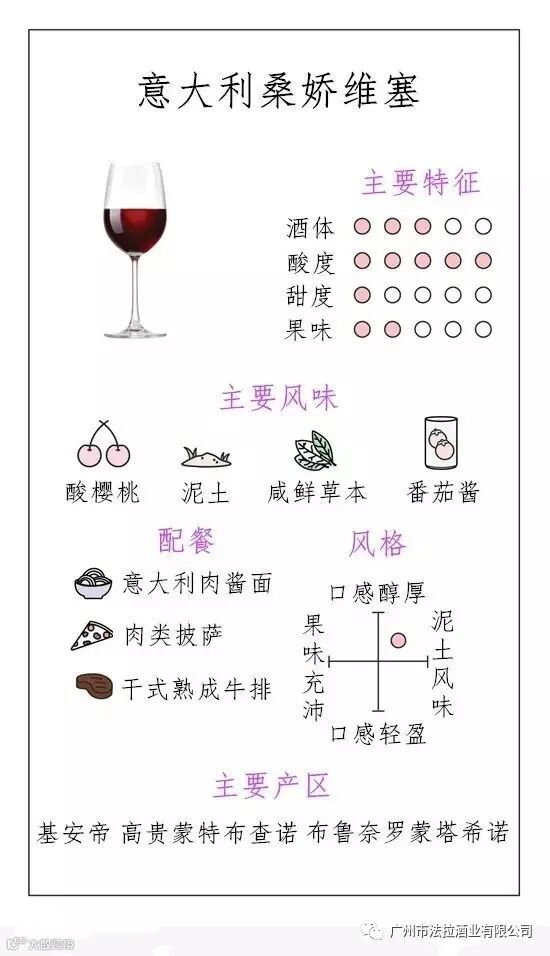 桑娇维塞是托斯卡纳最重要的葡萄品种,被酿造成著名的基安蒂、经典基安蒂(Classico Chianti)、布鲁奈罗、贵族葡萄酒(Vino Nobile di Montepulciano)及超级托斯卡纳葡萄酒等。基安蒂和经典基安蒂葡萄酒带有明显的酸樱桃、西红柿的风味,酒体较饱满柔顺,但不如布鲁奈罗和超级托斯卡纳厚重,陈年潜力也相对较差。布鲁奈罗葡萄酒单宁强劲,结构饱满有力,陈年潜力强,可长达 20 年之久。贵族葡萄酒也是托斯卡纳产区著名的 DOCG 葡萄酒,要求桑娇维塞的含量不得低于 70%,陈酿时间最低为 2 年,其中橡木桶陈酿1年以上,酒体要比普通基安蒂葡萄酒厚重,层次也更复杂,品质较高,陈年潜力较强。
