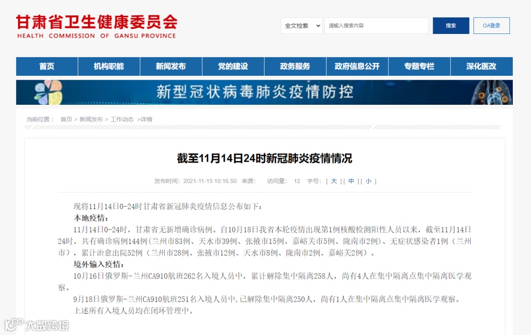 11月9日甘肃省无新增确诊病例,兰州市报告1例无症状感染者