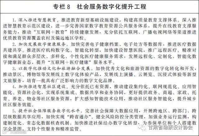 (二)提升社会服务数字化普惠水平。加快推动文化教育、医疗健康、会展旅游、体育健身等领域公共服务资源数字化供给和网络化服务,促进优质资源共享复用。充分运用新型数字技术,强化就业、养老、儿童福利、托育、家政等民生领域供需对接,进一步优化资源配置。发展智慧广电网络,加快推进全国有线电视网络整合和升级改造。深入开展电信普遍服务试点,提升农村及偏远地区网络覆盖水平。加强面向革命老区、民族地区、边疆地区、脱贫地区的远程服务,拓展教育、医疗、社保、对口帮扶等服务内容,助力基本公共服务均等化。加强信息无障碍建设,提升面向特殊群体的数字化社会服务能力。促进社会服务和数字平台深度融合,探索多领域跨界合作,推动医养结合、文教结合、体医结合、文旅融合。