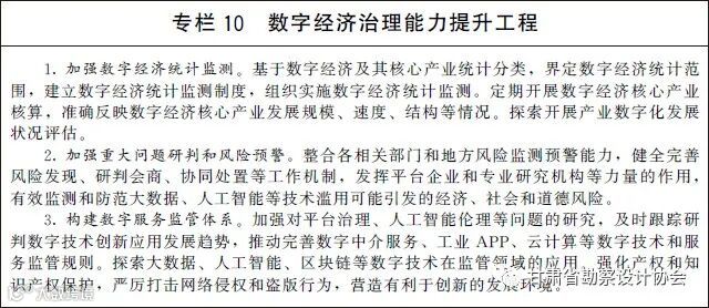 ——数字经济治理体系更加完善。协调统一的数字经济治理框架和规则体系基本建立,跨部门、跨地区的协同监管机制基本健全。政府数字化监管能力显著增强,行业和市场监管水平大幅提升。政府主导、多元参与、法治保障的数字经济治理格局基本形成,治理水平明显提升。与数字经济发展相适应的法律法规制度体系更加完善,数字经济安全体系进一步增强。
