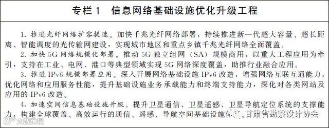 (一)加快建设信息网络基础设施。建设高速泛在、天地一体、云网融合、智能敏捷、绿色低碳、安全可控的智能化综合性数字信息基础设施。有序推进骨干网扩容,协同推进千兆光纤网络和5G网络基础设施建设,推动5G商用部署和规模应用,前瞻布局第六代移动通信(6G)网络技术储备,加大6G技术研发支持力度,积极参与推动6G国际标准化工作。积极稳妥推进空间信息基础设施演进升级,加快布局卫星通信网络等,推动卫星互联网建设。提高物联网在工业制造、农业生产、公共服务、应急管理等领域的覆盖水平,增强固移融合、宽窄结合的物联接入能力。