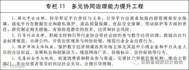 (三)完善多元共治新格局。建立完善政府、平台、企业、行业组织和社会公众多元参与、有效协同的数字经济治理新格局,形成治理合力,鼓励良性竞争,维护公平有效市场。加快健全市场准入制度、公平竞争审查机制,完善数字经济公平竞争监管制度,预防和制止滥用行政权力排除限制竞争。进一步明确平台企业主体责任和义务,推进行业服务标准建设和行业自律,保护平台从业人员和消费者合法权益。开展社会监督、媒体监督、公众监督,培育多元治理、协调发展新生态。鼓励建立争议在线解决机制和渠道,制定并公示争议解决规则。引导社会各界积极参与推动数字经济治理,加强和改进反垄断执法,畅通多元主体诉求表达、权益保障渠道,及时化解矛盾纠纷,维护公众利益和社会稳定。