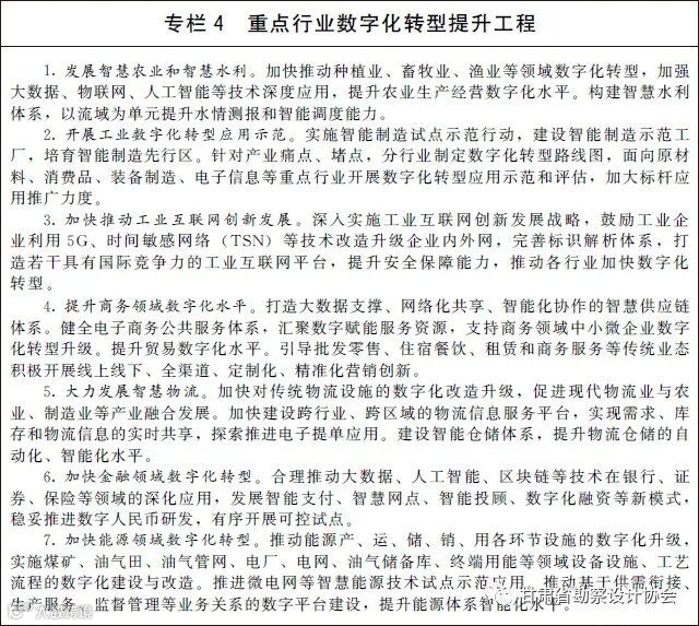 (二)全面深化重点产业数字化转型。立足不同产业特点和差异化需求,推动传统产业全方位、全链条数字化转型,提高全要素生产率。大力提升农业数字化水平,推进“三农”综合信息服务,创新发展智慧农业,提升农业生产、加工、销售、物流等各环节数字化水平。纵深推进工业数字化转型,加快推动研发设计、生产制造、经营管理、市场服务等全生命周期数字化转型,加快培育一批“专精特新”中小企业和制造业单项冠军企业。深入实施智能制造工程,大力推动装备数字化,开展智能制造试点示范专项行动,完善国家智能制造标准体系。培育推广个性化定制、网络化协同等新模式。大力发展数字商务,全面加快商贸、物流、金融等服务业数字化转型,优化管理体系和服务模式,提高服务业的品质与效益。促进数字技术在全过程工程咨询领域的深度应用,引领咨询服务和工程建设模式转型升级。加快推动智慧能源建设应用,促进能源生产、运输、消费等各环节智能化升级,推动能源行业低碳转型。加快推进国土空间基础信息平台建设应用。推动产业互联网融通应用,培育供应链金融、服务型制造等融通发展模式,以数字技术促进产业融合发展。
