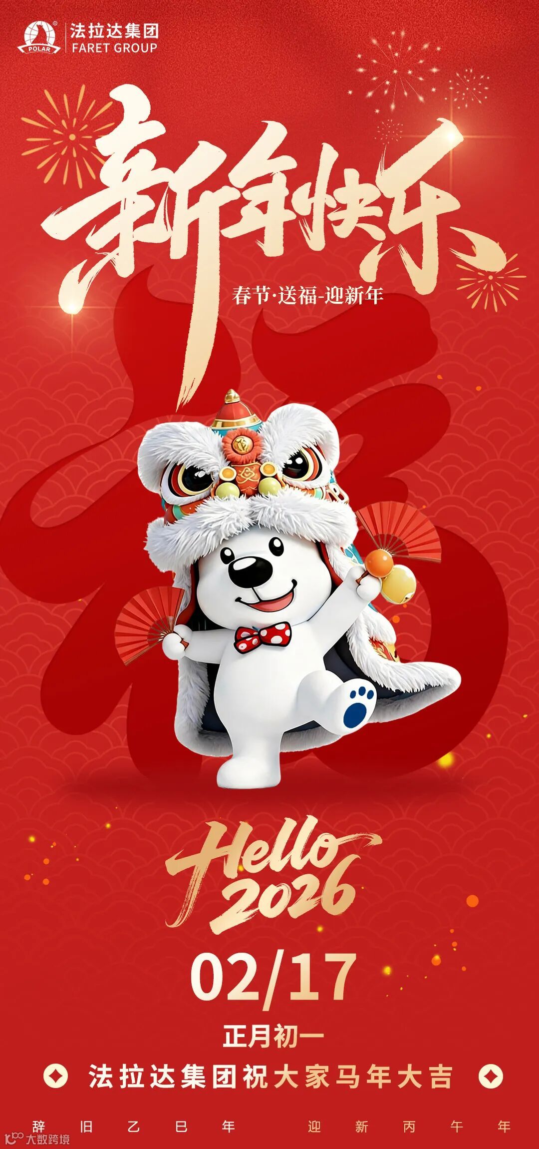 值此 2026 马年新春,千家万户张灯结彩,满怀憧憬迎接新岁。法拉达集团谨向您致以诚挚祝愿,愿我们携手相伴,策马同行,共绘新春盛景,共启辉煌新程!