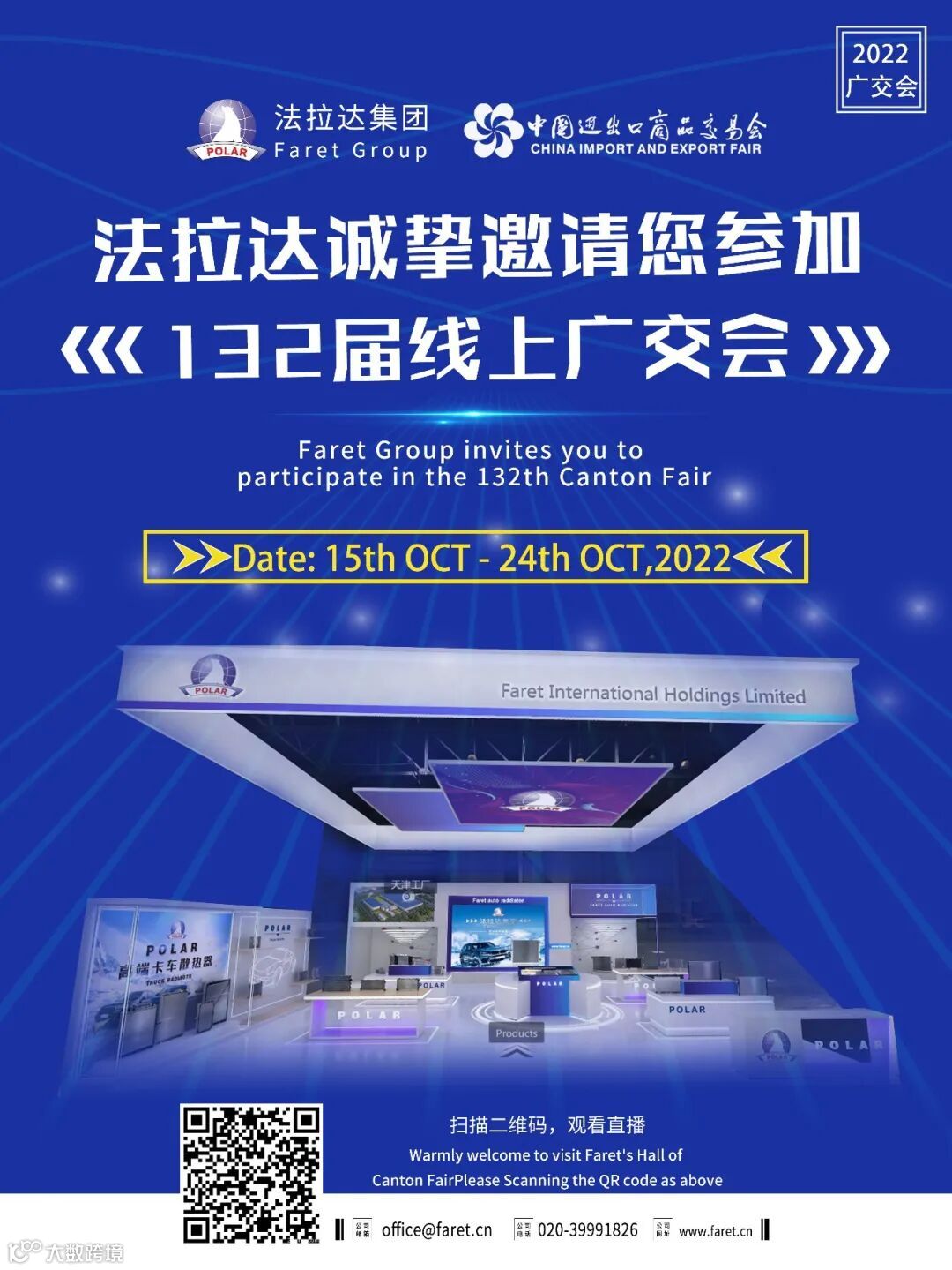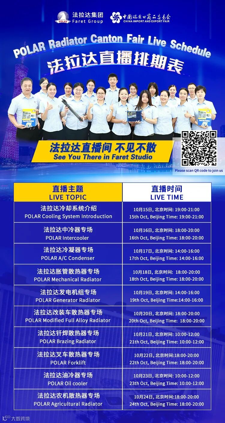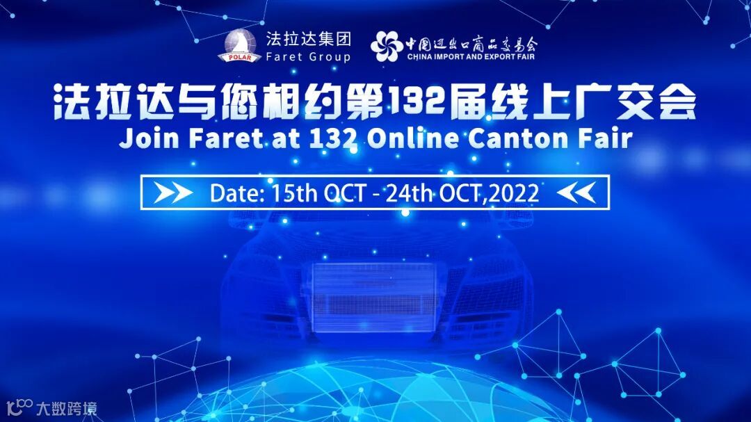 2022年第132届广交会将于10月15-24日在网上举办,展期10天,法拉达散热器、冷凝器、中冷器、油冷器等各类新品线上全球首发,视频、3DVR等形式上传海量展品,持续为客户带来更多高效精准创新型散热产品,畅享科技带来零距离,法拉达诚邀各界客户朋友,在线莅临指导!