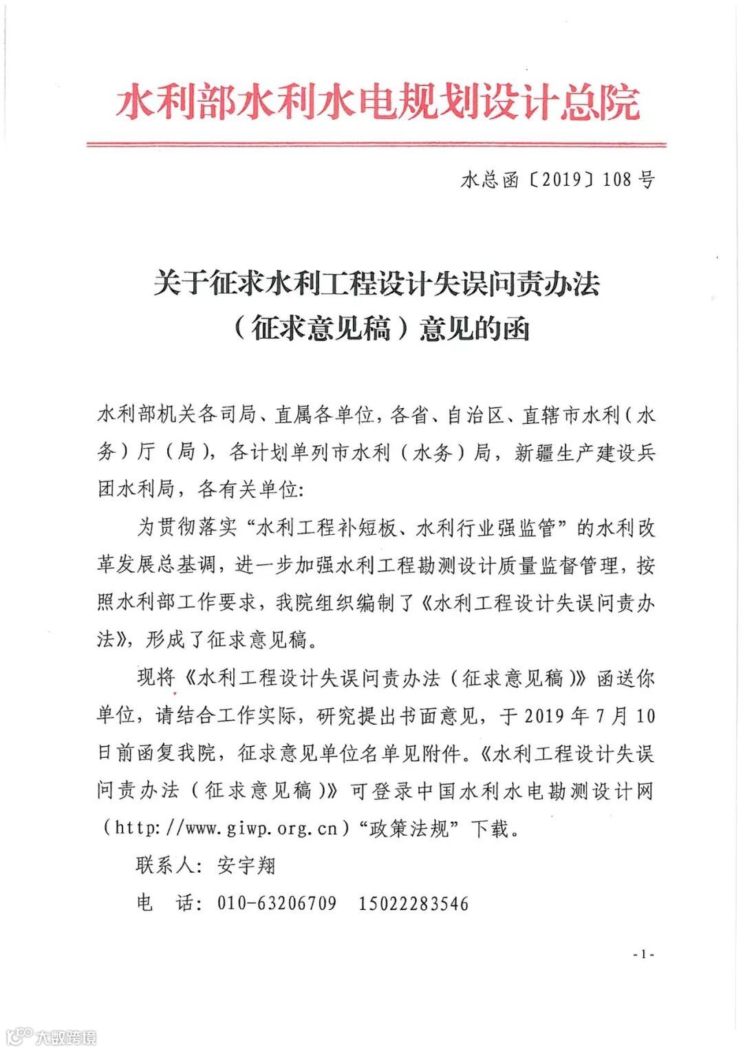现将《水利工程设计失误问责办法(征求意见稿)》函送你单位,请结合工作实际,研究提出书面意见,于2019年7月10日前函复我院,征求意见单位名单见附件。《水利工程设计失误问责办法(征求意见稿)》可登录中国水利水电勘测设计网(http://www.giwp.org.cn)“政策法规”下载。
