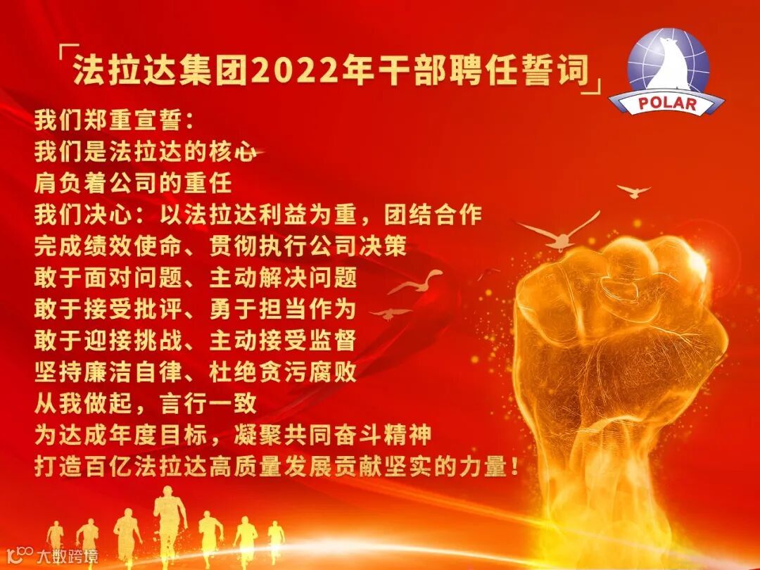 一年春作首,万事干为先。担当新使命,奋进新征程!2022年2月法拉达集团广州公司与天津公司对管理人员举行了隆重的授聘仪式。全体法拉达人在管理干部的带领下以虎虎生威的雄风、凝聚起奋斗的力量,共担新使命、共谱新篇章、一起向未来!