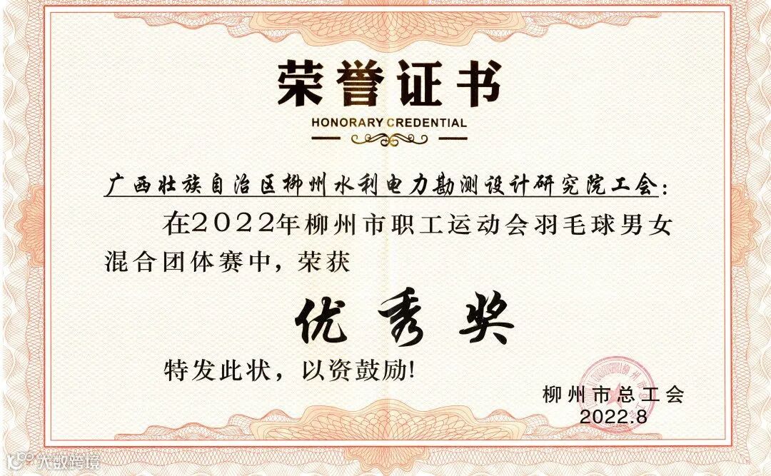 8月7日晚上,经过四天的激烈比赛,2022年柳州市职工运动会羽毛球男女混合团体赛在柳州市柳钢体育馆落下帷幕。柳州水电设计院羽毛球队在比赛中取得“优秀奖”的佳绩。
