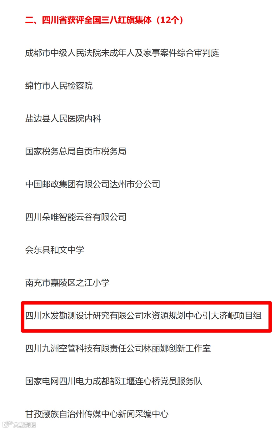 春启新程,捷报传来。“三八”国际妇女节将至,全国妇联3月2日在京举行纪念“三八”国际妇女节暨表彰大会。大会表彰了9名全国三八红旗手标兵、598名全国三八红旗手、400个全国三八红旗集体、600个全国巾帼文明岗。四川省有21名个人、12个集体、26个单位获表彰。其中,四川水发勘测设计研究有限公司水资源规划中心引大济岷项目组荣获“全国三八红旗集体”称号。