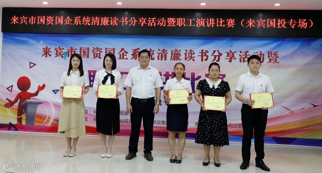 来宾国投集团党委副书记、工会主席罗仕勇(左三)与优胜奖选手合影