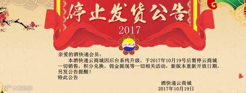 感谢你对本酒快递云商城的支持因后台系统升级,于2017年10月19号后暂停云商城一切销售,积分兑换,佣金提现等一切相关活动,新版本重新开放日期,