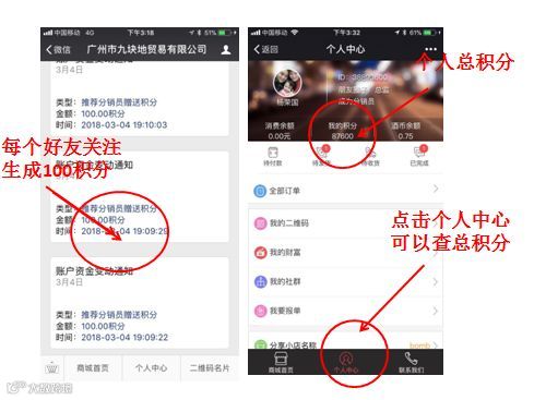 3、 每邀请一个人关注关注二维码名片,获得增加100积分(相当于人民币10元)